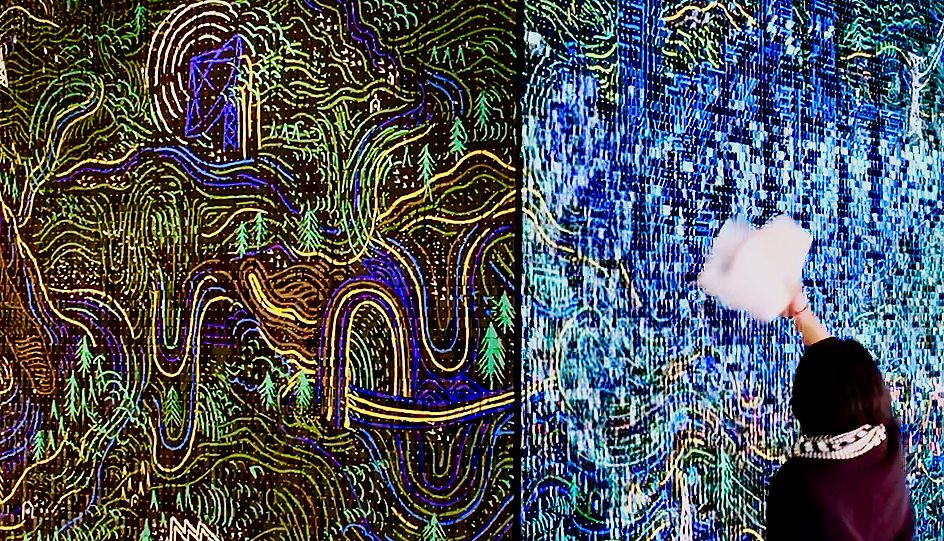 The installation features a colorful, shimmering view of downtown Denver and the mountains that gently sway with light and air, creating a calming environment for The Link coworking space in Denver.